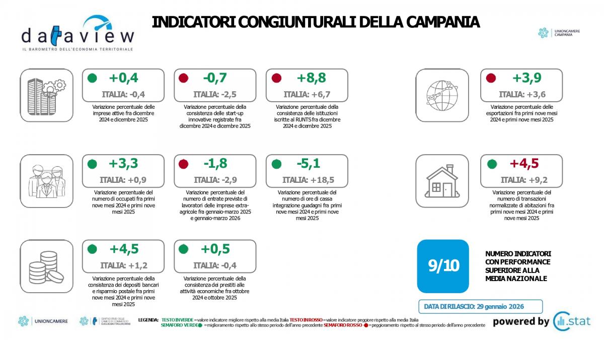 L’indagine congiunturale “Dataview”, curato da Unioncamere e Istituto Tagliacarne per monitorare l’andamento economico nelle 100 province italiane, vede la Campania tra le regioni più dinamiche del Mezzogiorno. Ben 9 indicatori su 10 mostrano performance superiori alla media nazionale, evidenziando un quadro congiunturale complessivamente positivo. Il quadro complessivo restituisce un’economia regionale in miglioramento, con segnali di vitalità diffusa e una capacità di reazione superiore alla media del Paese in quasi tutti gli ambiti analizzati.