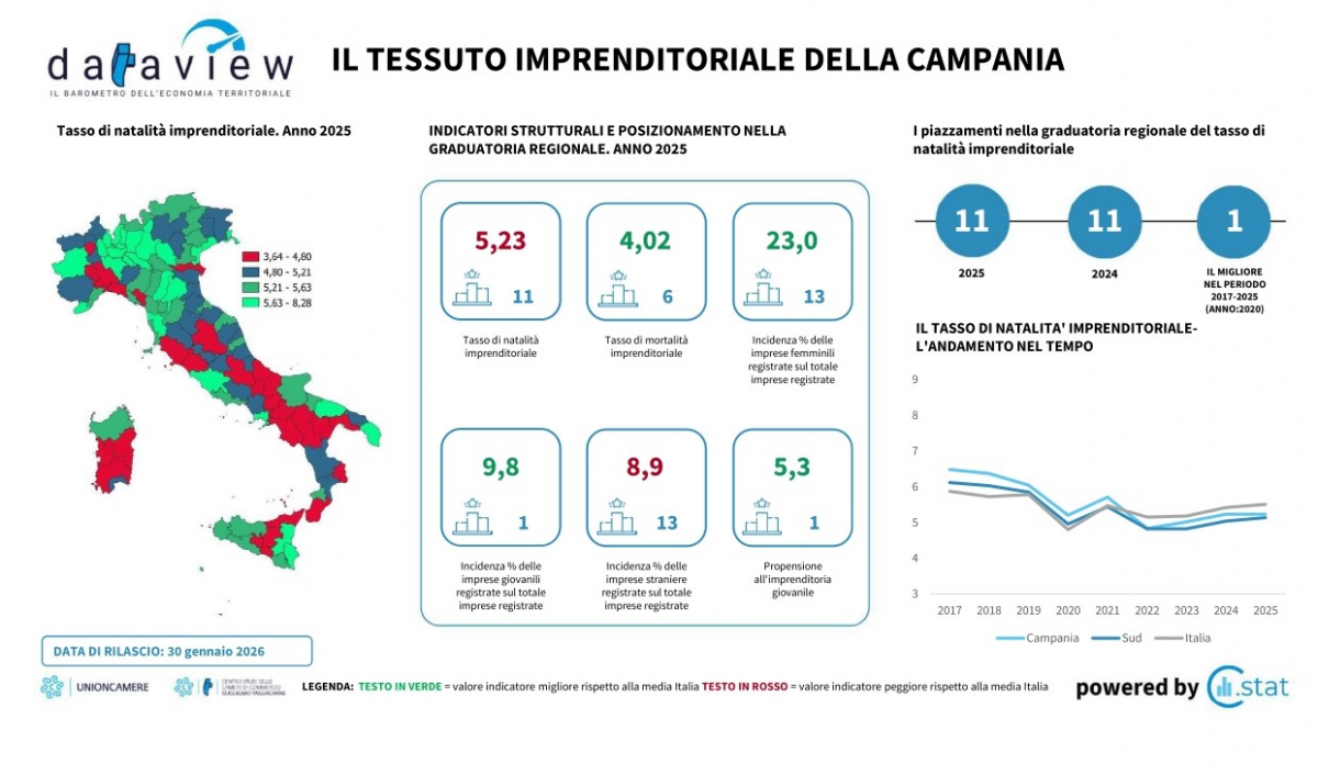 Nel 2025 la Campania registra un tasso di natalità imprenditoriale del 5,23% mantenendo lo stesso piazzamento dell’anno precedente (11° posto) ed un tasso di mortalità del 4,02%. L’analisi degli indicatori strutturali mostra un sistema imprenditoriale con una forte incidenza di imprese femminili pari al 23,0%, incidenza delle imprese giovanili del 9,8% ed imprese straniere: 8,9%. Complessivamente, la Campania si conferma una delle regioni più vivaci del Mezzogiorno, con una base imprenditoriale ampia e dinamica, in cui convivono microrealtà diffuse e nuclei produttivi avanzati in espansione ed una propensione all’imprenditoria giovanile pari al 5,3%.